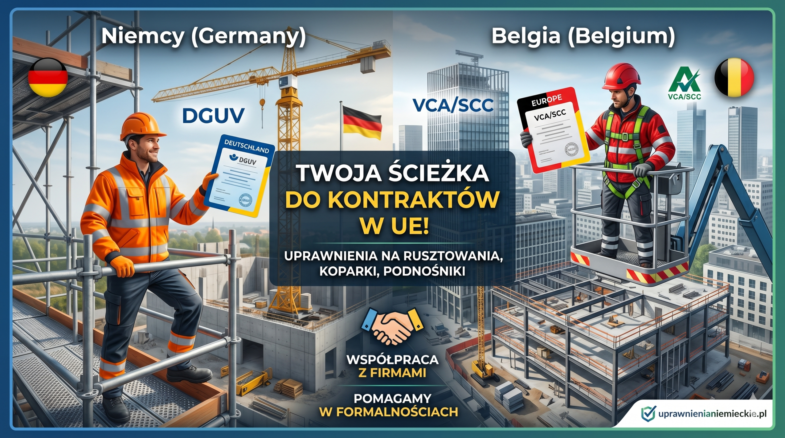 Szkolenia Niemieckie stacjonarnie bądź online z gwarancja najwyższych standardów. Nasze kursy obejmują szeroki zakres maszyn: koparki, wózki widłowe, suwnice, podnośniki, zwyżki. Zdobyta wiedza i umiejętności są potwierdzone uprawnieniami Niemieckimi , które są szeroko uznane w całej Europie. Dzięki nam w sposób ekspresowy możesz uzyskać potrzebne zezwolenia do pracy za granicą.