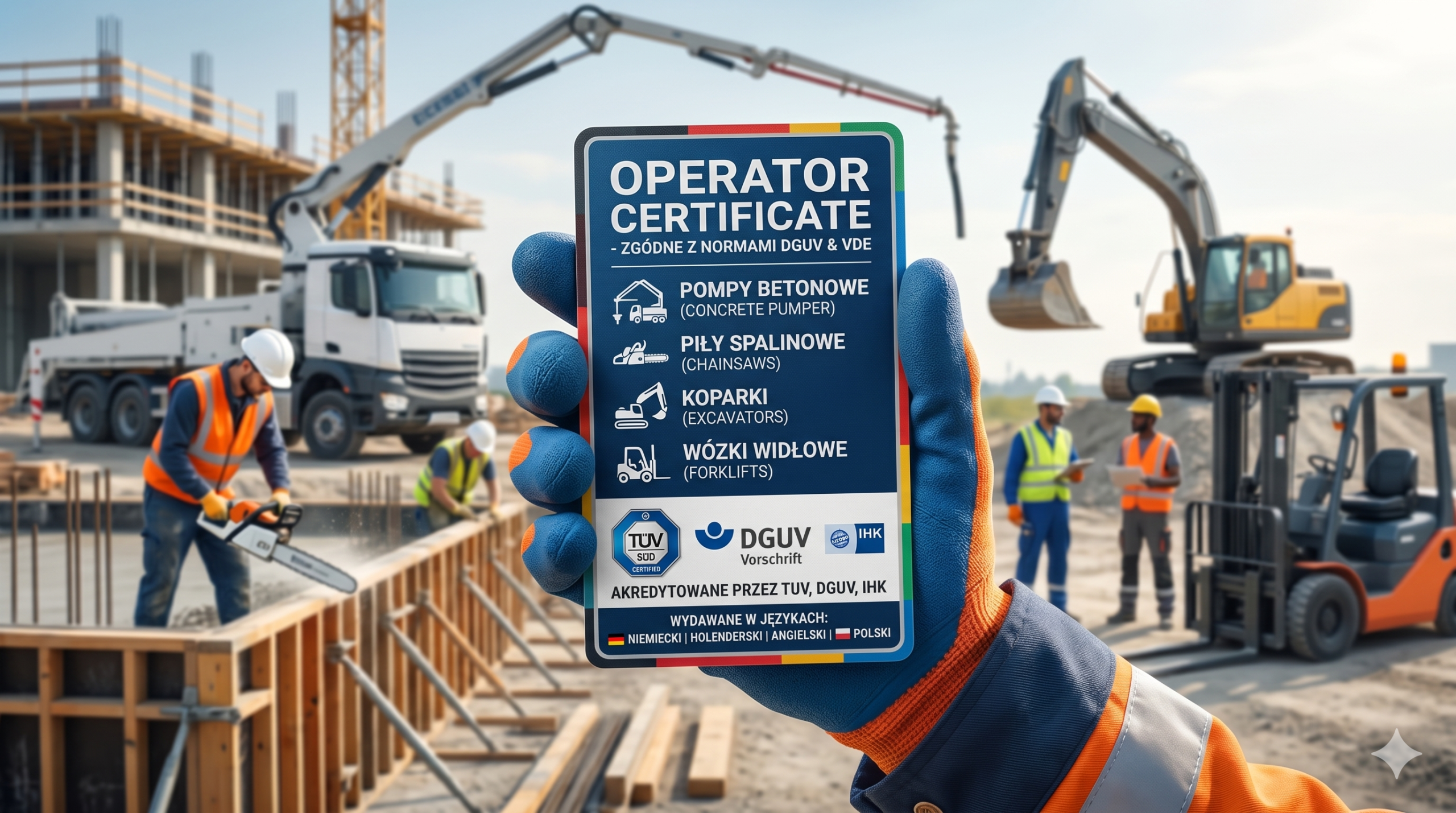 Każde uzyskane u nas uprawnienie jest wpisane do niemieckiego rejestru szkoleniowego i posiada unikalny numer kontrolny, który znajduje się na certyfikacie oraz karcie uprawnień. Uprawnienia te nie tylko umożliwiają pracę na stanowisku operatora maszyn, ale także poświadczają kwalifikacje zawodowe zgodnie z dyrektywami Unii Europejskiej.