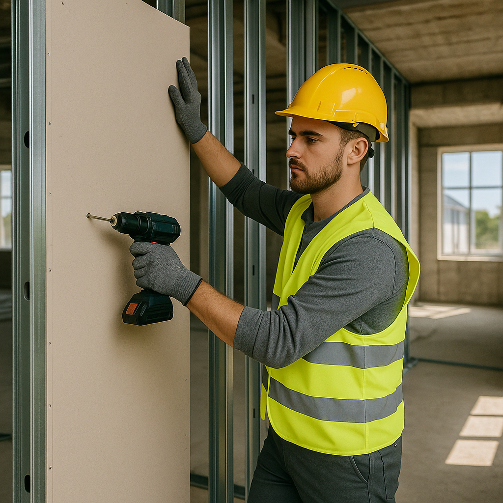 - Montaż GK: ściany działowe, sufity podwieszane, zabudowy.